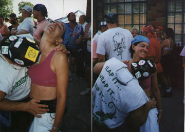 I had the pleasure of meeting Terry (above -- being Lum'ed) and Antoinette (left-- being licked) in Bentonsport, Iowa. They road with the team "Escape from New York". As you can see, Terry and Antoinette were ready for any of the hazards RAGBRAI had to offer (actually seems like Antoinette was enjoying her lickin').